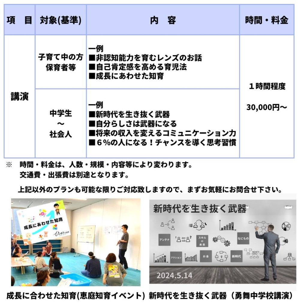 当塾は、子育てイベントでの特別講師や保育園・児童発達支援施設などからのご依頼による出張教室など、さまざまな場で幅広い年代を対象とした活動を行っております。ご要望に応じて内容を検討致しますので、まずはお気軽にご相談ください。